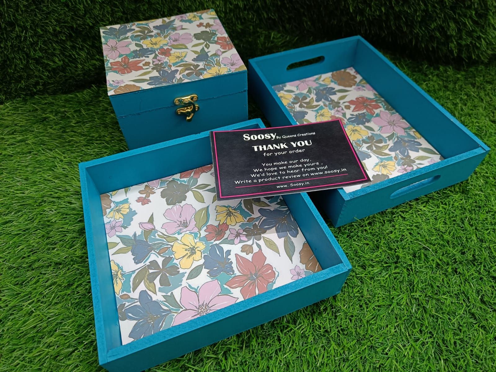 It has 1 piece of color printed tray (10*7), 1 piece of color printed box (6*6*3.5) , 1 piece of square color print tray (8*8) .