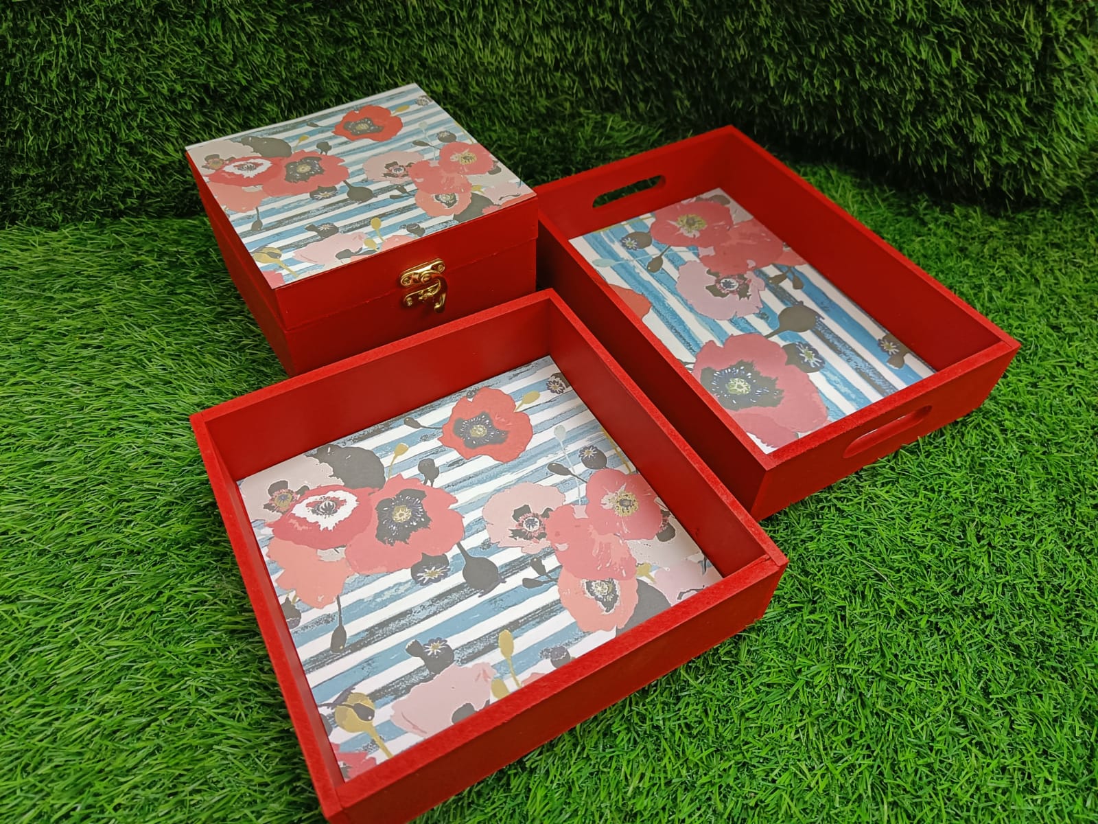 It has 1 piece of color printed tray (10*7), 1 piece of color printed box (6*6*3.5) , 1 piece of square color print tray (8*8) .